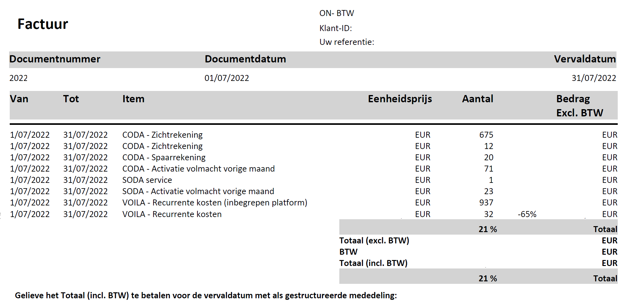 De factuur voor de maandelijkse kosten geeft aan hoeveel CODA, CARO, SODA en VOILA diensten je gebruikt (bijv. aantal zichtrekeningen) en hoeveel je in totaal betaalt voor de leveringen van de begonnen maand.